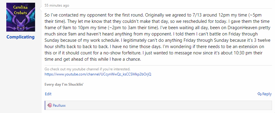 I'm online. Same user nameIt is 7:30 pm my time, I'm confused, im gmt-4 which is est, we should have the same timezone, i can battle right now