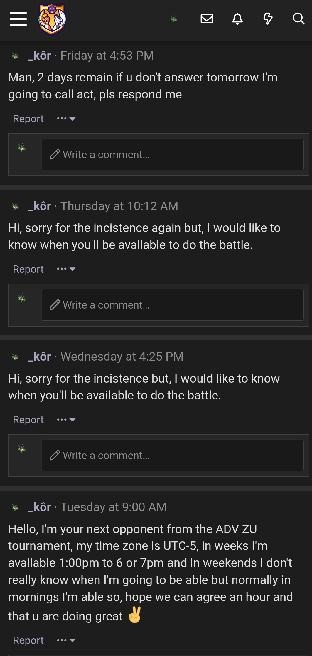 My opponent PuddingMcNick didn't respond my messages here's the link to his profile. I wait until now but he never answer me. Calling act