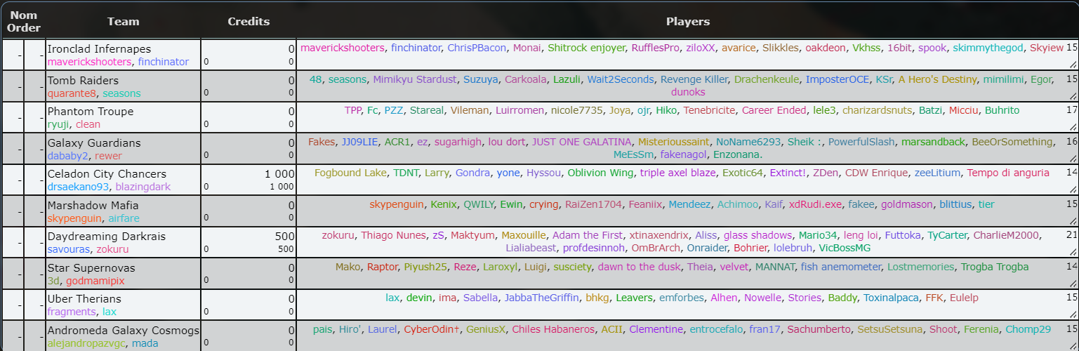 The hosts will ask the first team to nom a player. The nomination order will follow a snake pattern (meaning the order will be fully reversed every round). The tiers each player signed up for will be informed after every nomination. Then the bidding will commence, each player will have a starting bid of 3k, and every manager can put their bids on the chat raising a minimum of 0.5k (or 500) credits. If after some seconds there are no new bids, the player is sold to the team with the highest current bid. There will be a 5 second warning before the bidding for a player is closed. Managers are expected to have a list of players they intend to nominate, and draft so the auction goes as quickly and seamlessly as possible.