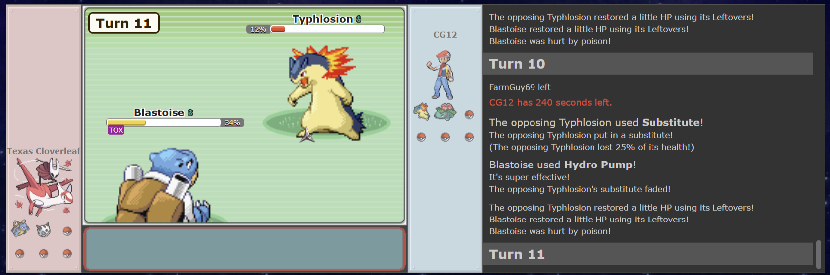 Our hubris is brought to light as CG12s plan is revealed - a Sub Toxic set is an effective way to break down Pokémon without recovery. This was a risky strategy, Typhlosion would have been completely useless if we had brought Thick Fat Rest Hariyama, but it is paying off in spades now. This Typhlosion has become enemy number 1, and I am forced to fire off Hydro Pumps into the Substitute as taking damage anywhere else is too much of a sacrifice defensively. Blastoise is the most expendable member of our team, both having been Toxiced and within our team strategy of using it to break open a hole. Over the next four turns we are fortunate as our Hydro Pumps all connect to break the Subs.