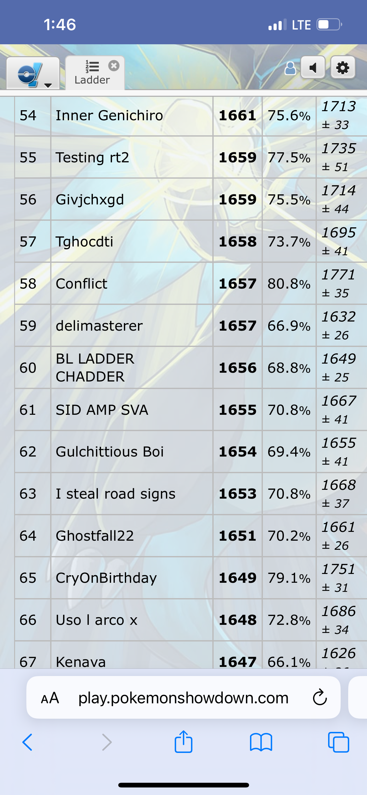 1500-1600 was Psychic, and damn this mono was good. No spikes access but so many excellent mons and access to rapid spin. I used a celebi cm pass team with mixed meta for shambles cores and sub salac medicham. Jinx lead is disgusting honestly and often makes people play bad immediately cause of the fear of being slept. A lot of people tried bringing in their blissey to absorb it but Jinx easily sets up on blissey if sleep is available. Also a single cm pass to stamie can win a lot of games which is nuts. Only issue with psychic is that lum Dd tar can straight up end you if you aren’t careful, but honestly it didn’t happen much.
