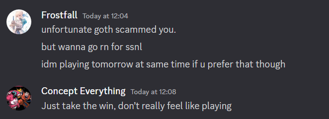 Use VMs to schedule with your opponent to make it easier for me to track activity calls when needed, and use this guide to ensure you don't lose via activity or coinflip. If you use other methods to contact your opponent outside of VMs, then post in this thread confirming you're in contact with your opponent; otherwise, it's not necessary. Extensions for those with time conflicts will only be given when proof is provided of scheduling with their opponent in the beginning of the round, so do not schedule last minute expecting to be compensated in case of timezone conflicts or be given an activity win over your opponent.