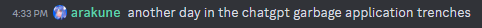 - Rough breakdown of applications I’ve read: 70% ChatGPT ramblings from unqualified people, 25% ChatGPT ramblings from qualified people, and 5% earnest and likable-sounding people who really want to break into the gaming industry but are tragically not qualified. It was so sad to be like “omg these words are written by a human yay!” and then immediately “noooo they have no relevant skills” :(