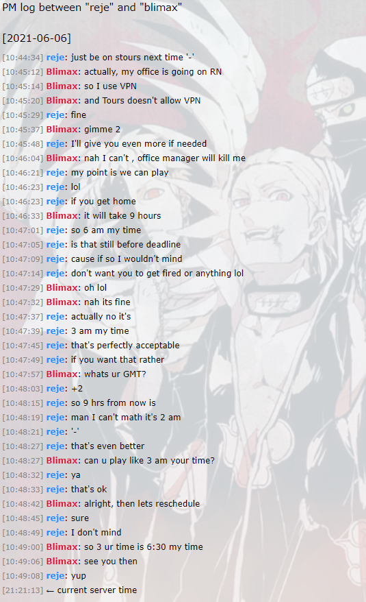 reje was willing to work around blimax's conflict at the original scheduled time and graciously rescheduled for 3am gmt+2. it is now 25+ minutes past the new scheduled time and reje needs to sleep.