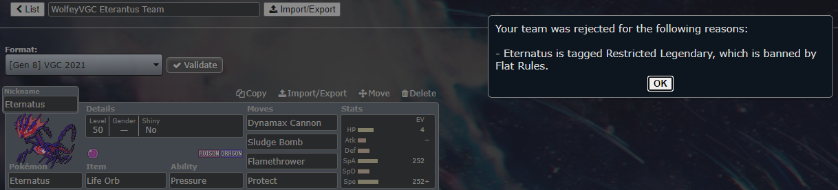 Despite Eternatus being labeled as usable under VGC 2021 rules, and I have made a replica of Wolfe Glick's team for that format from his challenge video, teambuilder is rejecting Eternatus under Flat Rules.