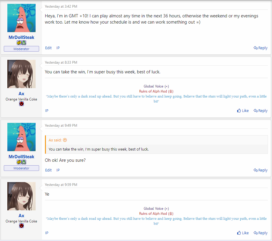 After subbing in Lucky Linoones for MrDollSteak, I was contacted by MDS to say that he had in fact responded to his opponent this week, but it was done via private message. As there was no heads up given to the fact that substitutions would be made this Thursday, I find it would unfair to follow through with it in this case. I'm reversing the decision, and the actual matchup will be as follows: