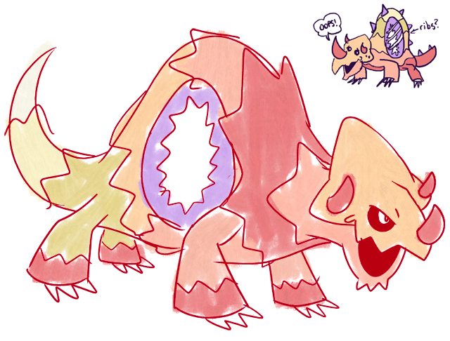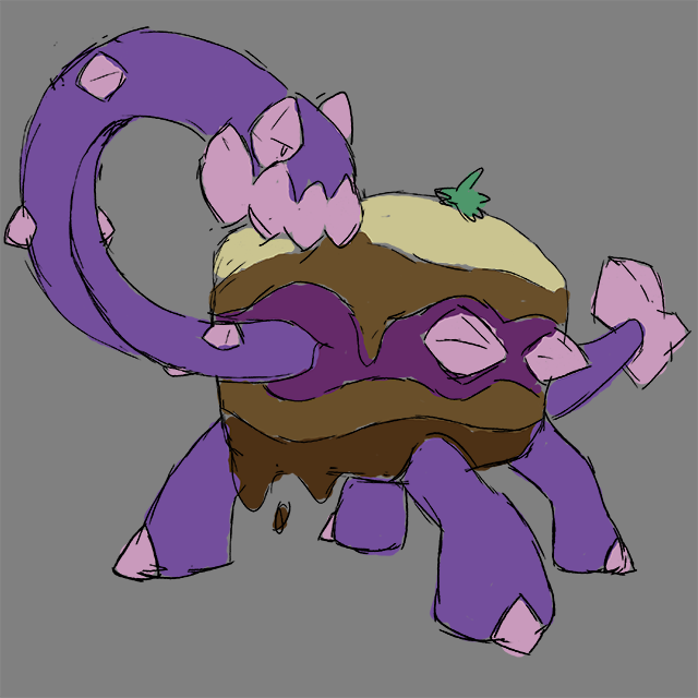 So diamonds are formed under pressure, which is what the "layer-cake" body is supposed to imply, with the diamonds in the middle. It's rather muddy too, which helps with the Water Absorb justification. I based it off of the dinosaur cryptid Mokele-mbembe from the Congo River (more Water Absorb lore eh?), since the Democratic Republic of the Congo is one of the world's top diamond exporters. I also chose a dinosaur because of "fossil fuels," which are formed under pressure like diamonds. Some ankylosaur thrown in there too.