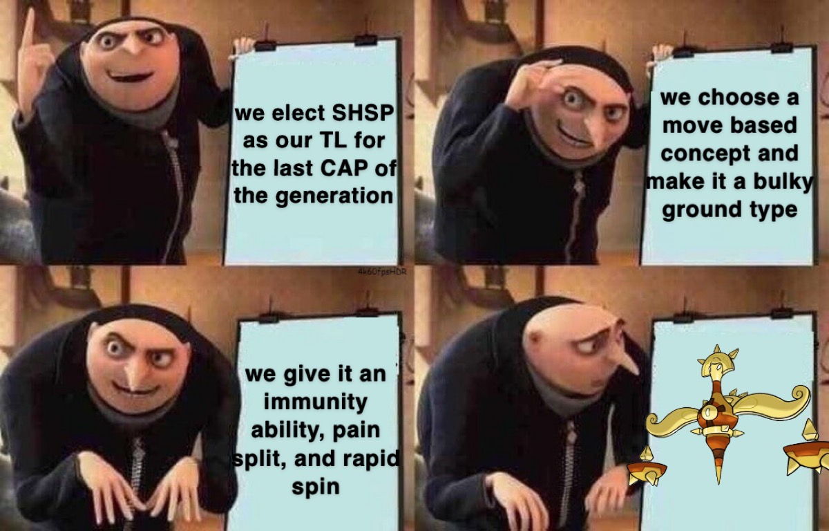 Once again, I'm proud to show the final product of a CAP Process. CAP 31 has been an incredible process, both in general and for myself personally. We've had some really incredible discussions throughout each stage. In typing, we found our way through STAB vs non-STAB typings and ending up with a unique one- the second monotype CAP ever, the first since Stratagem all the way back in DPPT. Ability had a ton of amazing discussion debating the pros and cons of immunities and leveraging our signature Diamond Storm. Moves and Stats similarly had in depth debates over a CAP that was in an unusual spot of being left more open ended and less defined going into the back half of the project. I'd like to take a moment in this post to give a few thanks, as well. Firstly, the CAP Mod Team was once again amazing as usual, helping myself and the TLT every step of the way. Next, the TLT- you guys are not only some of my best friends on this site, but you guys are absolutely incredible leaders and workhorses of the project, and really stepped up to get us across the finish line when my life started getting significantly more busy. Lastly, I just want to thank the community at large: this process is incredibly special to me, between being my second go at TLing, and being timed in the middle of my last year of school, graduation, and starting the next step of my life. You guys are one of the best groups of people I've had the good fortune to meet and be around, and I really can't thank you enough.