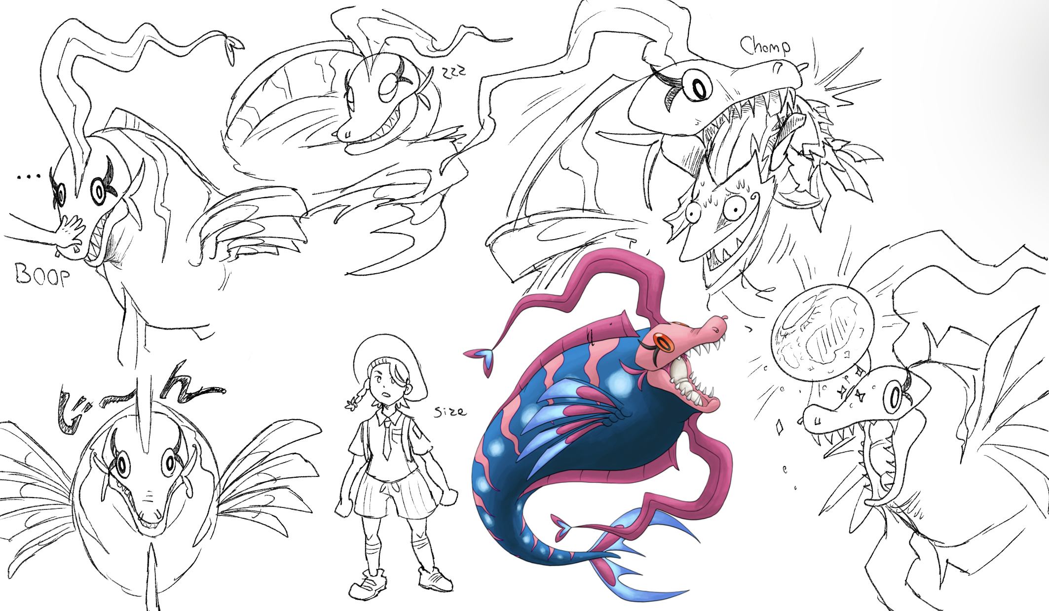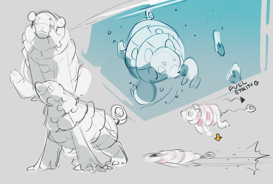 My first rendition was unfortunately very ugly, and I went back to redesign with a more "Fairy" image in mind.. I rounded the Pangolin/Sloth's face to look cuter and it ended up turning into a Seal -> more like a Bear now... but Bears swim too so- I continued. The design already had Toy elements from the Conch pull-string; and I decided to further that, turning the shell into a layered jigsaw puzzle. Teddy Bear + Puzzle + Pull Toy, is where the Fairy themes come in; I didn't want to play too much into a Plush Bear image because Bewear already occupies that role.