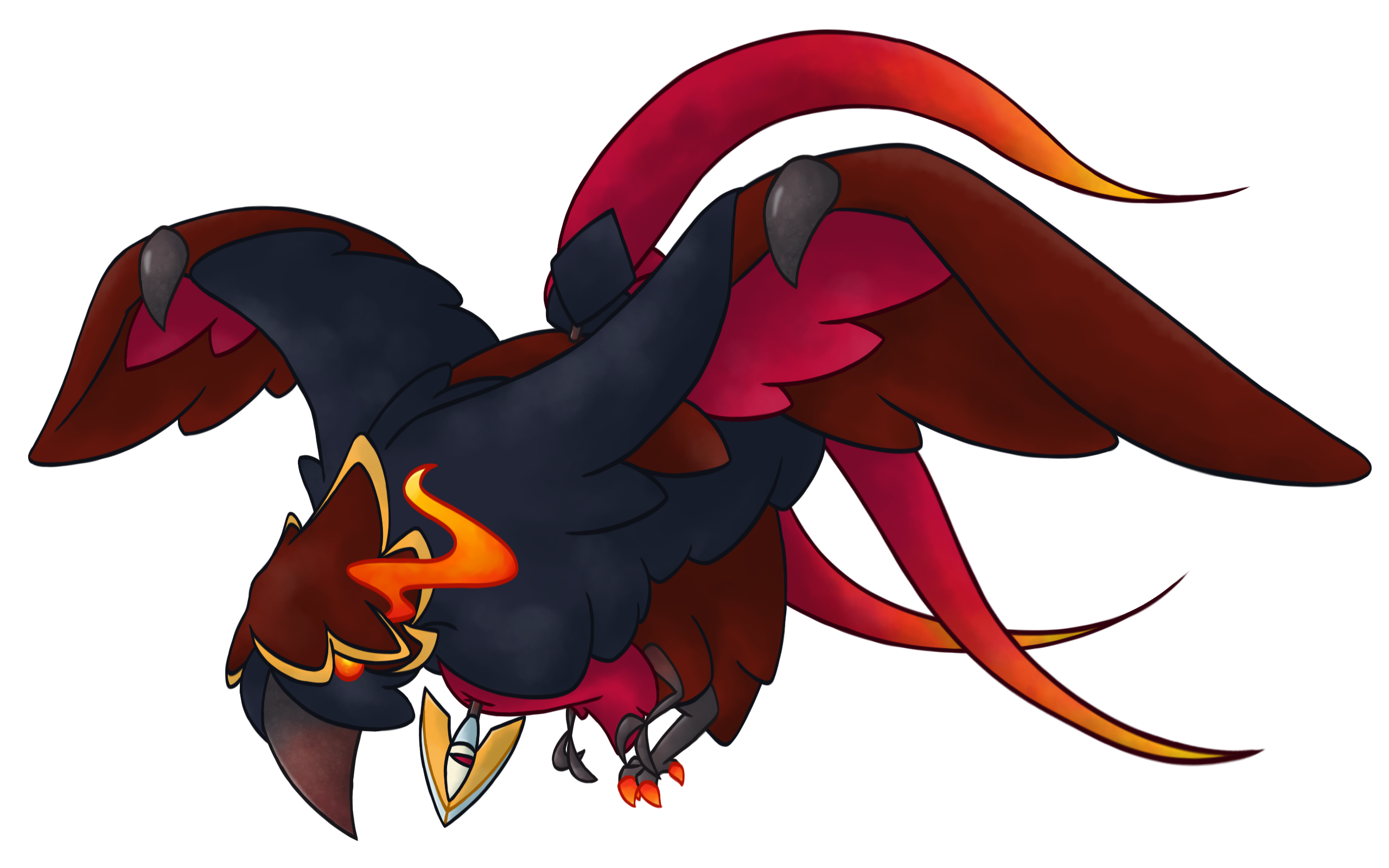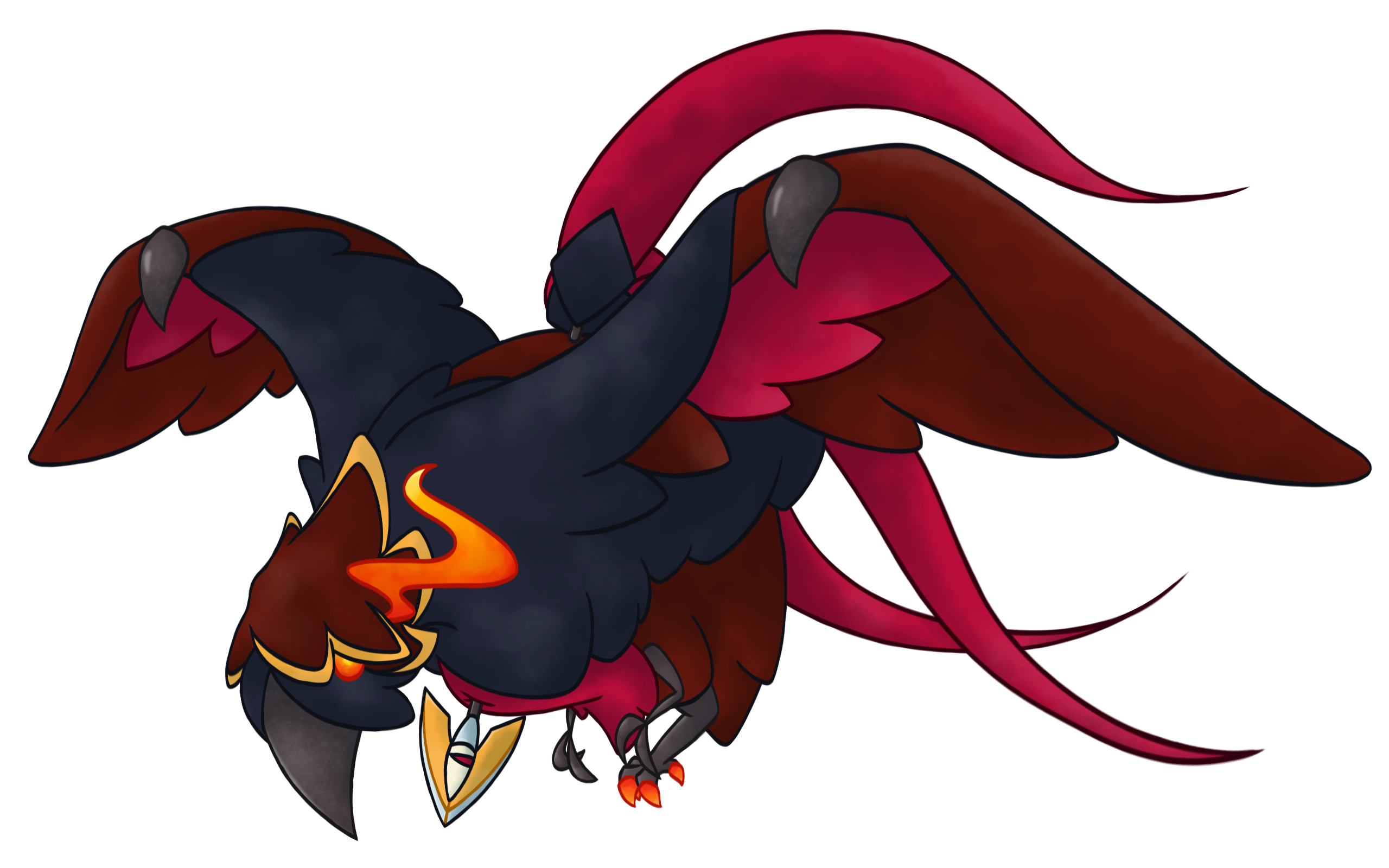 I think the other hardest part was deciding how to do the (tail) feathers and wings. Solved that issue with the wings by referencing Sigilyph, but wasn't sure on the feathers because a lot of the time they looked too blocky or cloth-like. After awhile I did figure out that making them rounder and more drop-shaped fixed this issue (along with shortening 2 of them), and even accidentally added the middle black line to make them even more like feathers. Colors are simple, I just borrowed them from Murkrow lol