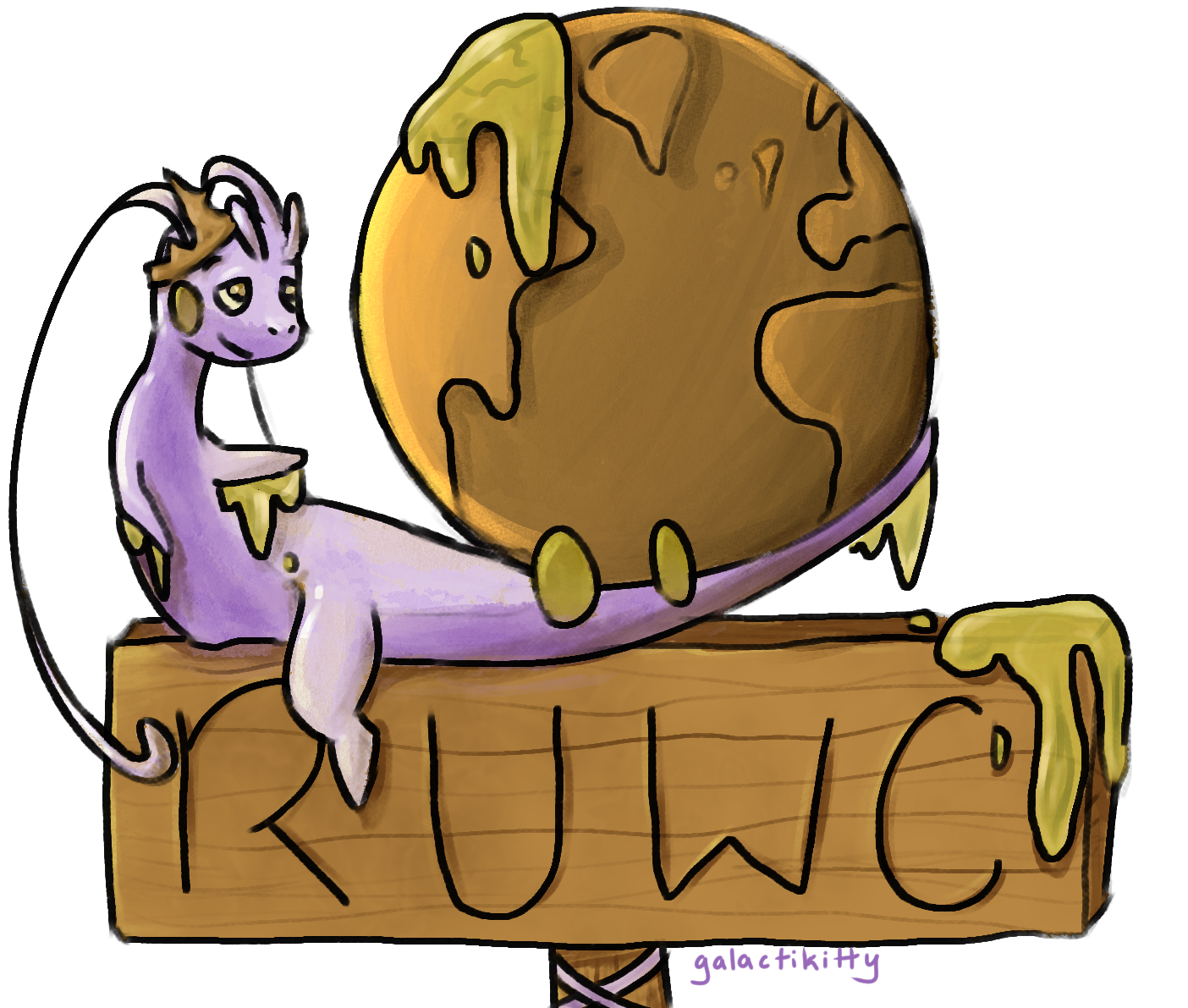 This was the first version for the RUWC logo as requested in The Workshop! I did take some creative freedom with positioning and all, but I loved the idea of Goodra-H with the tail being a globe, so I really wanted to try it. I really like the woodgrain pattern I drew into the sign, and the shading of the slime, though feel the clarity of my pose/silhouette could use work.