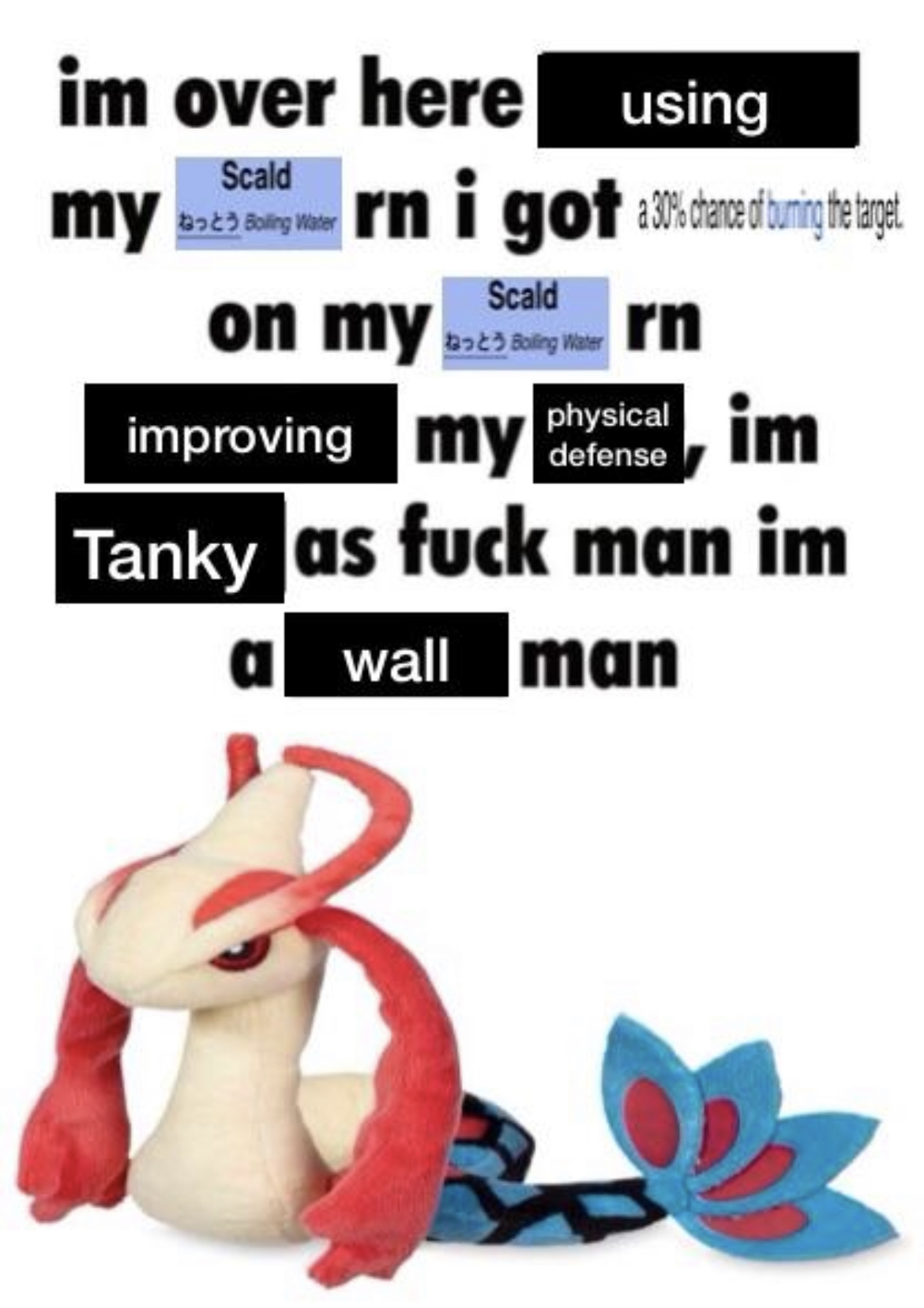 **Water-resistant Pokemon**: Specially offensive Dragon-types like Hisuian Goodra and Noivern don't mind being burned by Scald and can wear Milotic down over the course of a battle, though the latter doesn't like taking Dragon Tail. Wo-Chien takes practically nothing from Milotic's attacks while draining it with Leech Seed and Ruination; however, it dislikes being burned by Scald.