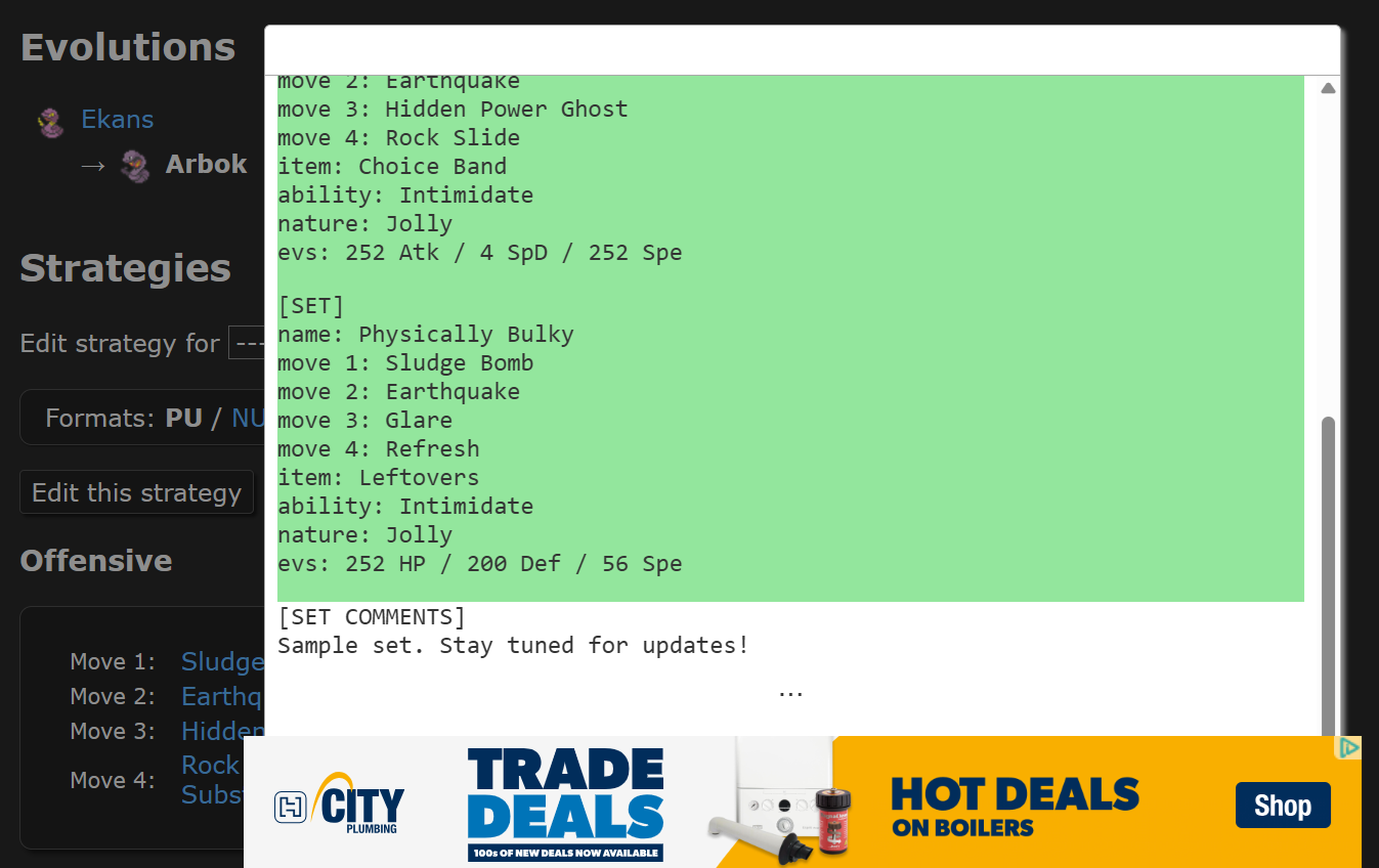 When hovering over the word "Speed" on a Pokemon's base stats in a Smogon Dex entry, it will display the final Speed stat for each set of a Pokemon. This is a useful feature. However, it does not properly interact with the fact that a Pokemon's set can have multiple EV spreads. In particular, it will only pull the first EV spread and use that to compute the displayed Speed stat. This produces undesired outcomes in two situations: