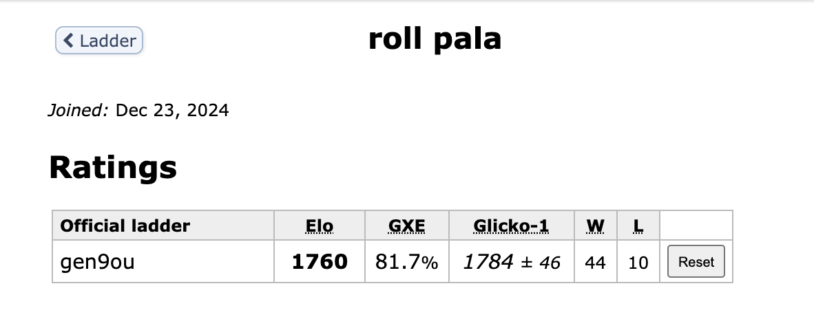 The team's performance is nothing crazy, but Sticky Web teams in general are fishing for good matchups. I personally do not like laddering often, but using something silly like this and watching Palafin get reverse sweeps was a great time. I did my best to optimize this team, but there will always be poor matchups for gimmick teams like Sticky Web. I have not tested the team on high ladder, as my peak is in the high 1700s. If anyone uses the team and can reach a higher peak (i.e. 1800 and beyond), please let me know here. I would love to hear your opinion of the team, what you like about the team, how it can be improved, and your thoughts on the RMT in general. I hope I did a good job of presenting the team and my ideas to you.