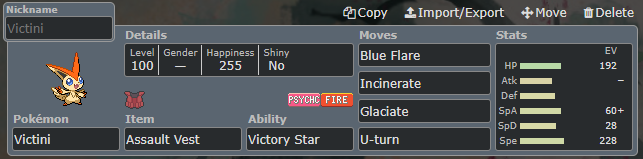 Victini helps Diancie get rid of bulky steels such as M Gross and Ferro which is really cool, also providing speed control and having access to Glaciate prevents things like Lando T from directly switching in, SpA invest OHKOS no bulk M Gross with Blue Flare which helps prolong Diancie's longevity and improve the M Gross matchup, allowing Diancie to do Diancie stuffs better