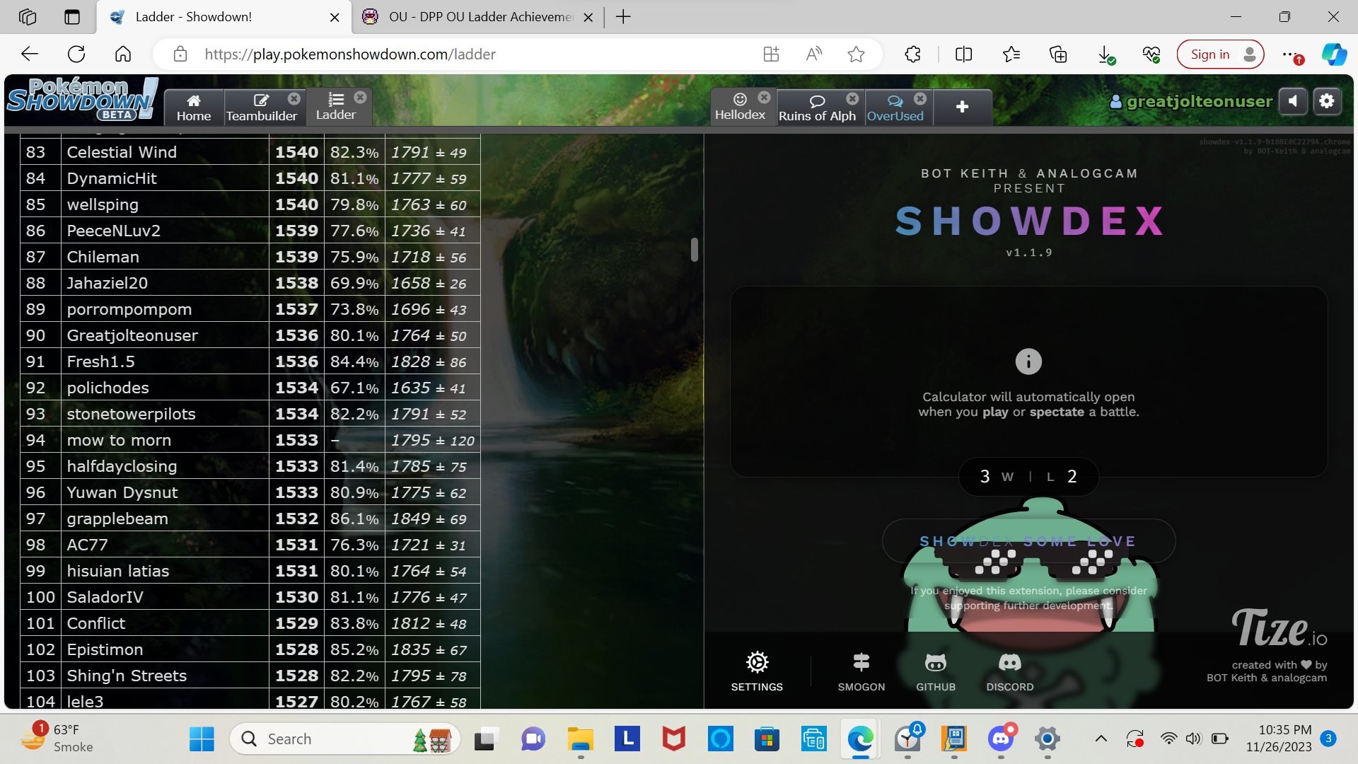1698 (so close to plat knowledge) - https://replay.pokemonshowdown.com/gen4ou-1957419513-wmjs4ttj41zoo1xt77lka3x7j72ab68pw
