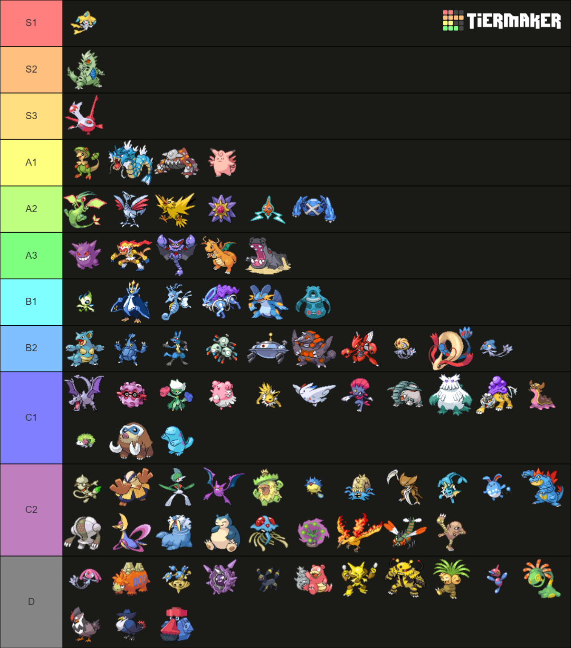 I think these 3 are all a little bit more inconsistent in their impact in a game, but are all undeniably top tier. SubSplit Gengar is nearly impossible for stall to get rid of without running Blissey, and it also matches up really well vs offense. My main issue with Gengar is its reliance on a terrible inaccurate move, and if it learned Aura Sphere I would put it one tier above, next to Starmie and Lucario. The main reason I have TTar this high is because there are so many important targets for scarf TTar to trap (Starmie, Gengar, Latias), but I think the DD sets with random berries to help setup like Passho or Shuca or Lum are pretty impactful too - kind of like Gyarados, but a bit worse. I've seen a lot of games where Scarf TTar was the only way to handle a runaway Starmie/Gengar/Latias, but I also have seen a lot of games completely lost to scarf TTar providing a free sweeping opportunity to Breloom or Lucario or Infernape, so I think TTar is hard to rank, but around here feels right. Latias is worse as an offensive threat than offensive Starmie and Gengar imo. Part of the reason I think that is that it loses to them 1v1 (assuming HP Fire, if no HP Fire it can speed tie Gengar), but I also think clicking D Meteor as Specs Latias is less likely to make progress than clicking Hydro Pump as Starmie or Sub as Gengar. However, Latias has some nice bulk which lets it switch in a bit, and it has some tricky options with Trick and Healing Wish that make it stand out enough to still be considered top tier. I think a lot of the reason I am putting it this low is due to meta shift. Something like Latias is not going to do well with defensive Jirachi and TTar everywhere. I think it's just a bit outclassed and the mons ranked above it do a bit better in the matches I've experienced. The top 8 is very close imo, and I think Latias is in practice not really a worse mon to use than Gengar or even Jirachi, but this is just how I feel based on this current snapshot of the metagame I played recently.