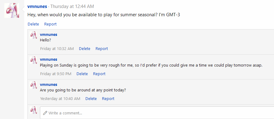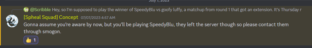 My opponent SpeedyBlu got an extension last week, but ended up never playing their game so I didn't know who I was playing until it got coinflipped on Thursday. I reached out to SpeedyBlu on Friday via their Smogon wall, but never got a response. Judging by how they didn't play their week 1 game, are no longer in the draft Discord, and haven't been on the forums since Monday, I don't think they seem very interested in playing in this tournament