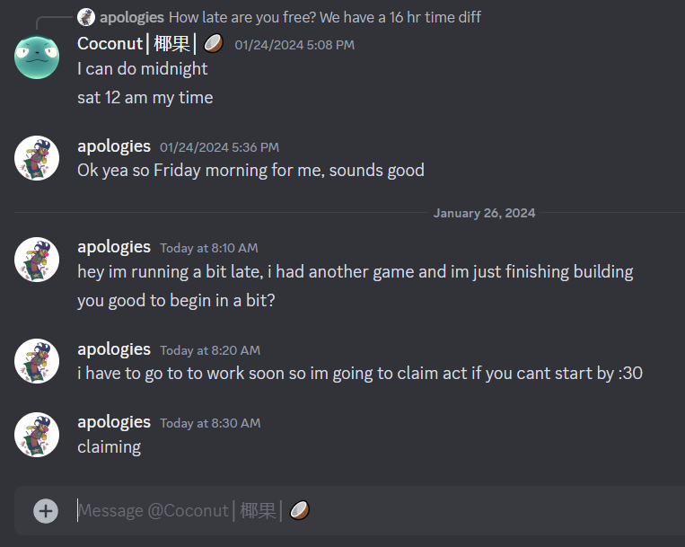 chimp Go Bananas Jan 26, 2024 #51 Activity Win Requested. I posted on my opp's wall on Monday, but haven't heard back. My schedule is busy today and tomorrow.