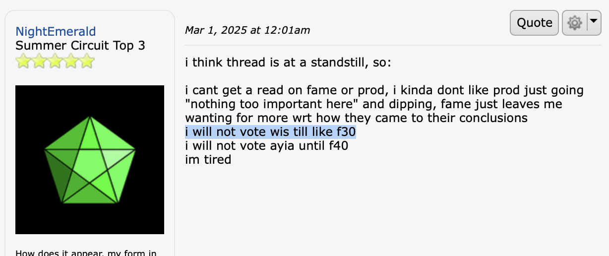 I'm also struggling with this feeling that it's /so weird/ that M2H came after me for his level 1 "strong players didn't get killed n1" bs instead of AP. I think he's probably second to NE for having weird interactions with others because it feels like his reads are so disconnected from the rest of the thread but somehow nobody feels like they are pushing him on it? Outside of wist?