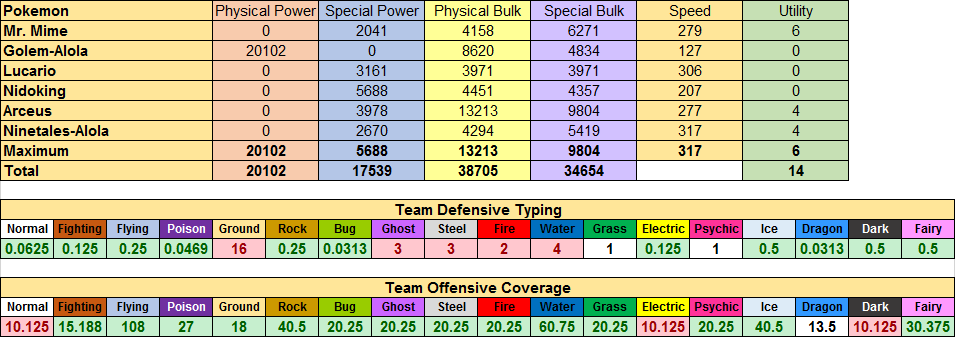 - Team Offensive Coverage: all of the offensive coverage abilities for your team multiplied together, with "positive" (green) coverage coming at 5 pokemon hitting neutral STABs and one super effective and "negative" (red) coverage if all 6 pokemon cannot hit with at least a neutral STAB total.