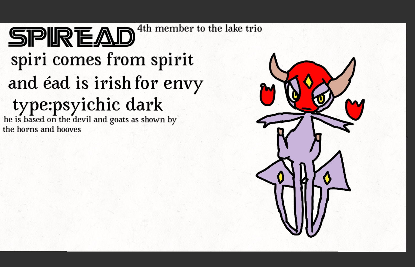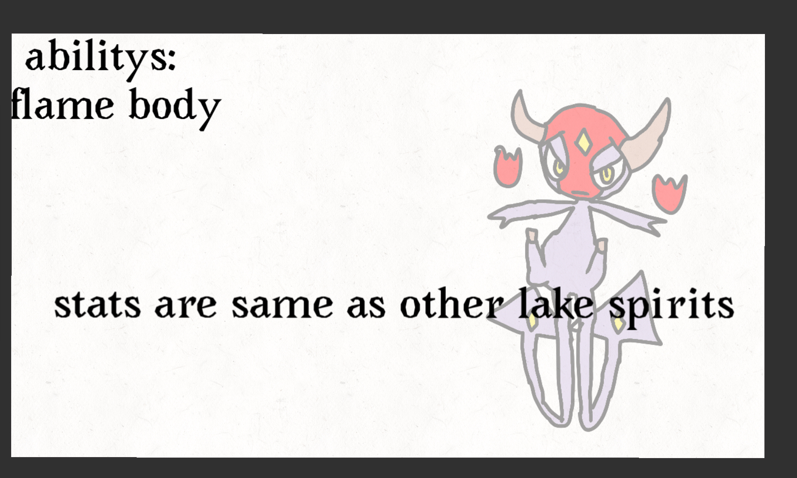 I haven't thought too much about stats, but Whinesprite would be fast, of course, and most likely a physical attacker. Rattled or Adaptability could be fun abilities!