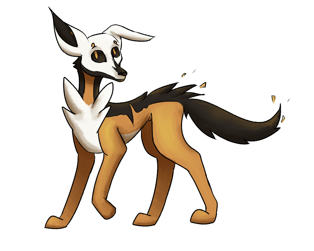 This is Whinesprite, a Ghost/Electric-type based on my dog! Whine referencing the sound a dog makes, and sprite referencing both a ghost/spirit the windsprite breed (which my dog is!). Colors are based primarily off of my dog's coloration, though have been simplified and I've leaned into the warms/yellows for the Electric typing. Ghost-typing is visually referenced by the skull-reminscent markings on the head, and is alluded to with the EKG monitor design across the torso!