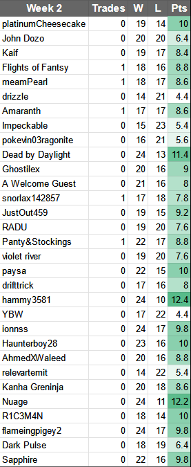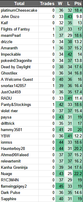 I'll admit I'm still not sure how the scoring really works for this but looking at the W-L ratio made me a little sceptical so I tried counting it myself (in order of my spreadsheet):Standings sheet is available to follow along