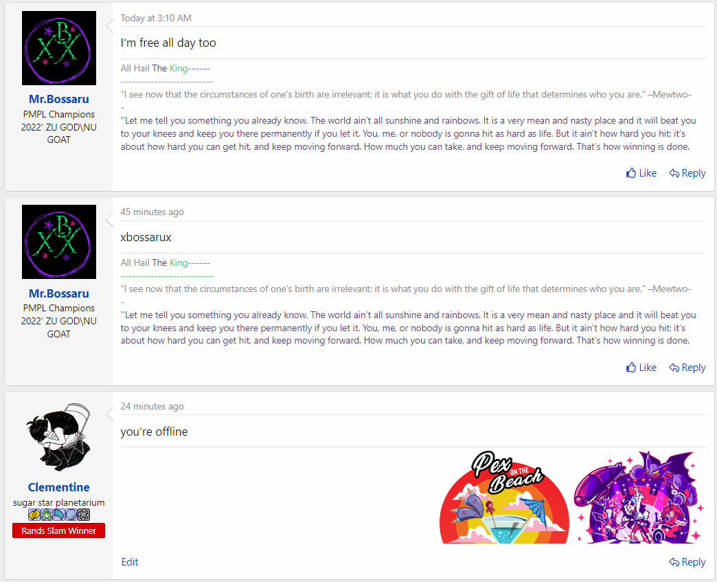 • All scheduling attempts MUST be done publicly on Smogon walls. No other proof of communication will count for act calls regarding scheduling attempts.
