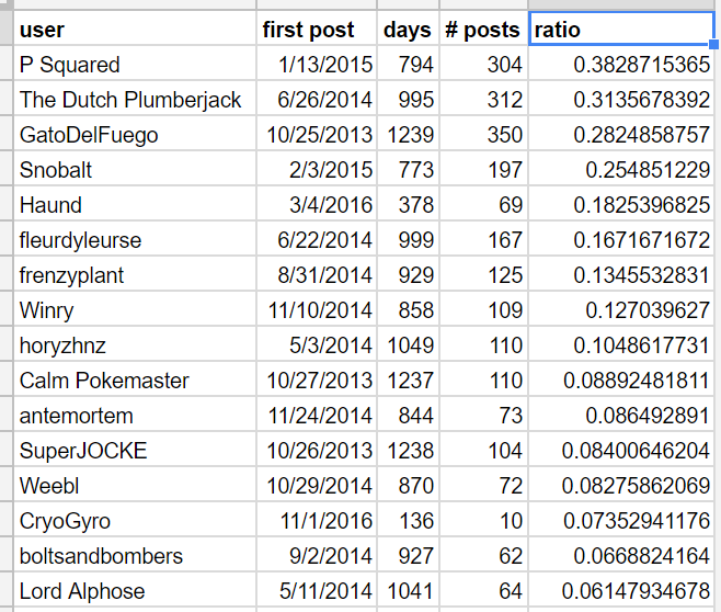 Top 16 "number of posts" divided by "days since first queue post" (effectively "posts per day"):