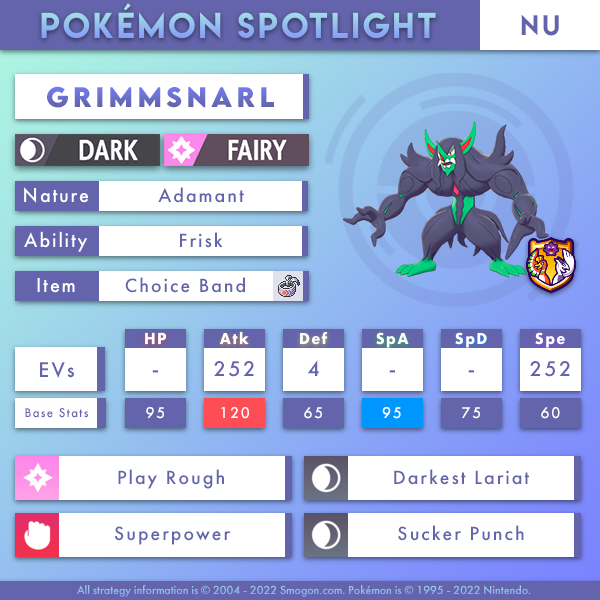 Grimmsnarl's menacing presence terrorizes NU! As one of the tier's most recent drops, Grimmsnarl has quickly established itself as a fierce wallbreaker, owing to its impressive Attack stat and offensive movepool. Moreover, its unique STAB combination is unresisted by the whole metagame; when boosted by Choice Band, Grimmsnarl can 2HKO defensive staples such as Sylveon, Vaporeon, and Vileplume. Darkest Lariat also lets it muscle past Defense boosting foes like Stamina Mudsdale and Curse Snorlax. Superpower OHKOes Stakataka and Copperajah, while Sucker Punch compensates for its mediocre Speed tier and allows it to pick off weakened faster threats such as Silvally-Ground, Salazzle, and Starmie. Alas, its frailty mandates pivot support; hence, it appreciates teammates like Passimian, Rotom-C, and Dragalge that can bring Grimmsnarl in safely. Additionally, they tend to invite in Pokemon like Xatu, Guzzlord, and Copperajah, respectively, which allows Grimmsnarl to wreak havoc afterwards. Furthermore, Dragalge overwhelms a shared check in Diancie, while Choice Scarf Passimian outspeeds offensive Pokemon that Grimmsnarl does not, as well as pressures a common defensive answer in Mudsdale.