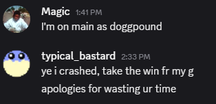 About playing on alts: It is entirely allowed to play on an alt other than your own main forum name, though if your opponent wishes to confirm your identity, you must log on to your main alt to show them you are who you claim to be. This is to prevent people from pretending to be who they're not. Furthermore, pretending to be another player in relation to a tournament battle is strictly prohibited. Do not try to impersonate or play as another player.