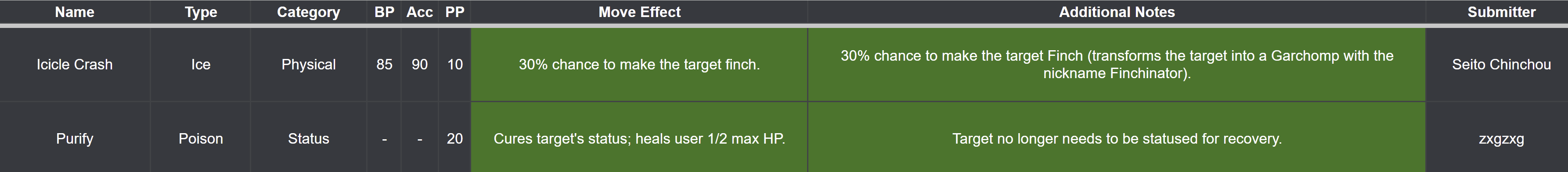 Icicle Crash: That is a funny change if I see one, replacing the annoying chance of Flinch by a 30% chance of a risky but useful status in forcefully transforming the target into Finchinator (a Garchomp), with the possibility of getting rid of their STABs if they weren’t Dragon / Ground already. Not useful against Physical Attackers, but definitely troublesome for walls and Special Attackers, and they won’t survive another Icicle Crash for sure.