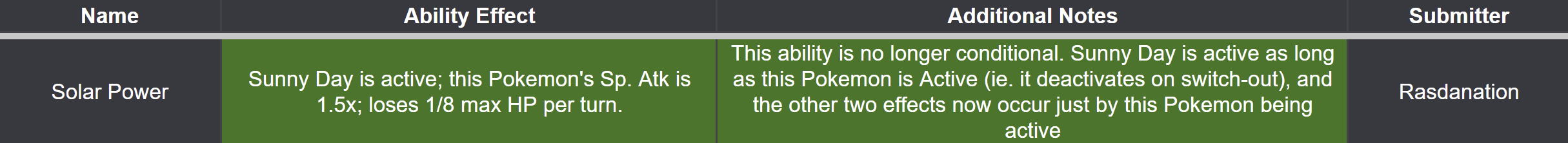 Solar Power: It’s not even a poor man’s Desolate Land, as much as the Sunny Day can be overriden by normal weathers. The 1.5x Special Attack at all time at cost of 12,5% HP loss per turn, alongside one-turn Solar Beam, 75% HP Synthesis (in the case of Sunflora) and effective Water neutrality for the Fire-type users give the wielders a more devastating prowess while simultaneously ruining opposing weather teams and without putting the wielder’s Water-type teammates in jeopardy in Singles.