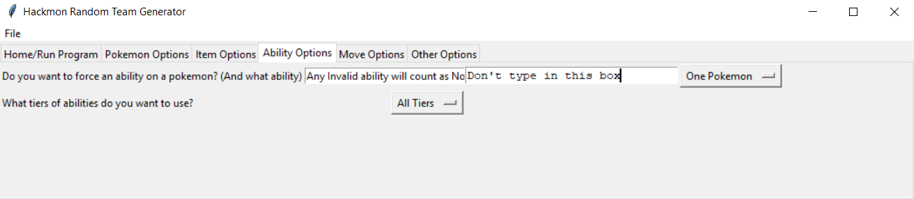 My program is on GitHub, a Code sharing website, on this link: https://github.com/jrober14/Tkinter-Hackmon-Random-Team-Generator