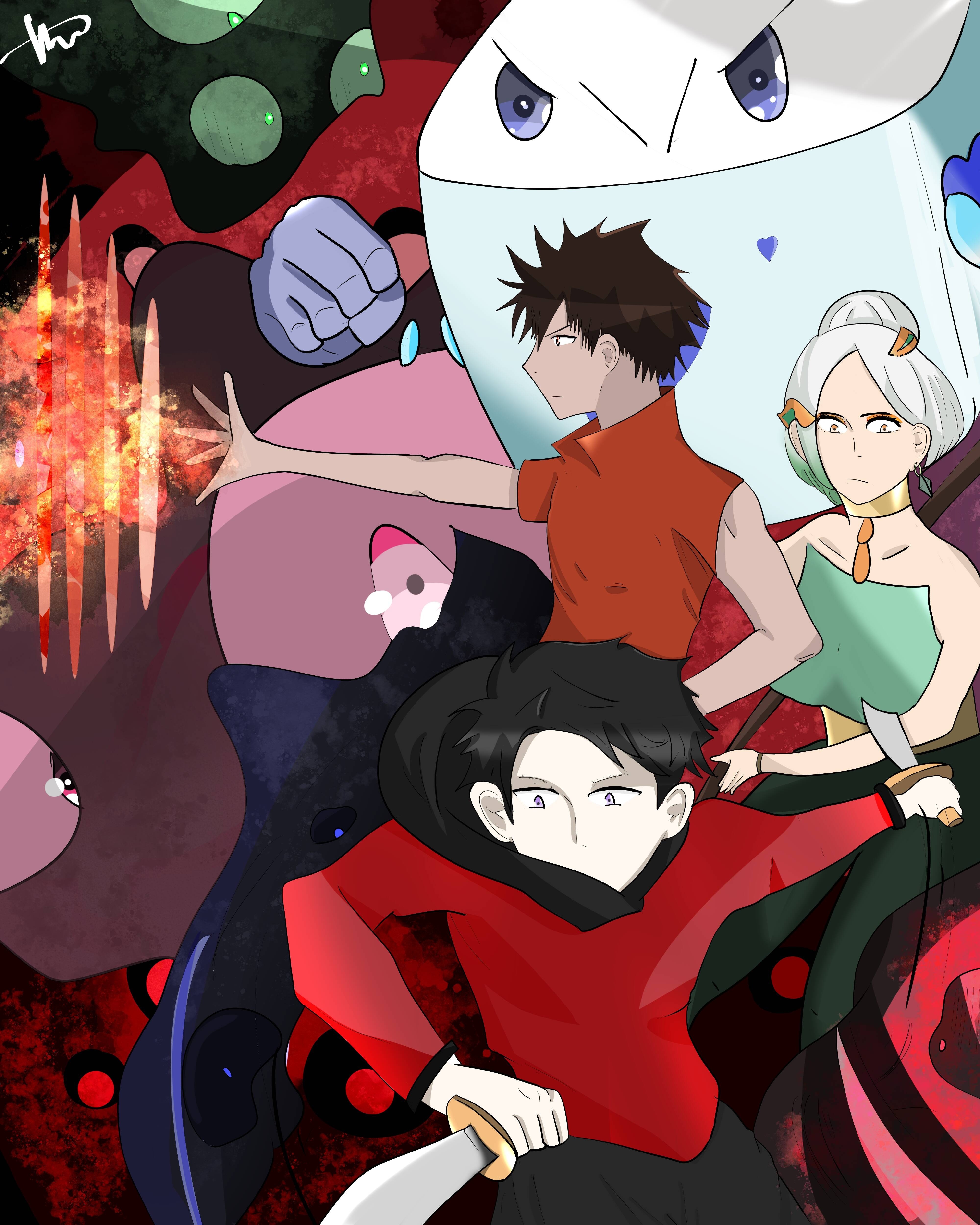 First one is a design I'm trying to come up with based on light and frequencies. Very happy with the bg/monster if anything. Second one was just a completely random piece I made which was meant to have one oc, but I ended up making 2 new ones and developing another one because my art is constantly random! Third was an art trade