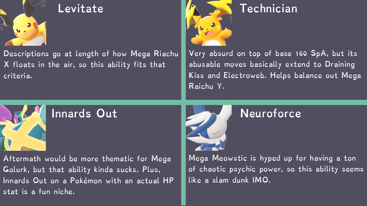 Let's get the elephant out of the way. The ability to float off the ground via electromagnetism has been heavily marketed with this Pokémon, it is showcased not only in its key art but in sprites in game. Levitate imo is clearly THE ability that Gamefreak wants for this Pokémon, and on a guy with a pure Electric typing, in theory this isn't awful. Unfortunately the painful truth of the matter is that Raichu is extremely hard to justify as a Mega Zapper even with Levitate, it has no way to boost its physical attack, and is still outclassed by a majority of Electric Pokémon and even it's twin Mega Raichu Y. So I think we have a few options. Transistor would be a quick way to immediately amp up its damage output of its STAB move of choice, making Volt Tackle really strong. However, personally I don't think this is the path. The following two abilities imo are the best bet. Electric Surge allows Raichu to not only hit just as hard with Volt Tackle, but facilitates mixed sets that can abuse the extremely potent Rising Voltage as well, making it a good "mixed" attacker. However in my opinion, the BEST option would be to grant Mega Raichu X with Galvanize. Mega Raichu gets access to both Fake Out and Extreme Speed in Legends ZA, which would make it the sole user of -ate FakeSpeed in the tier, making Raichu hold a role of being a potent priority based revenge killer in the tier. This immediately sets it apart from all FIVE pure Electric Megas that are on the table right now. So I am standing behind Galvanize.