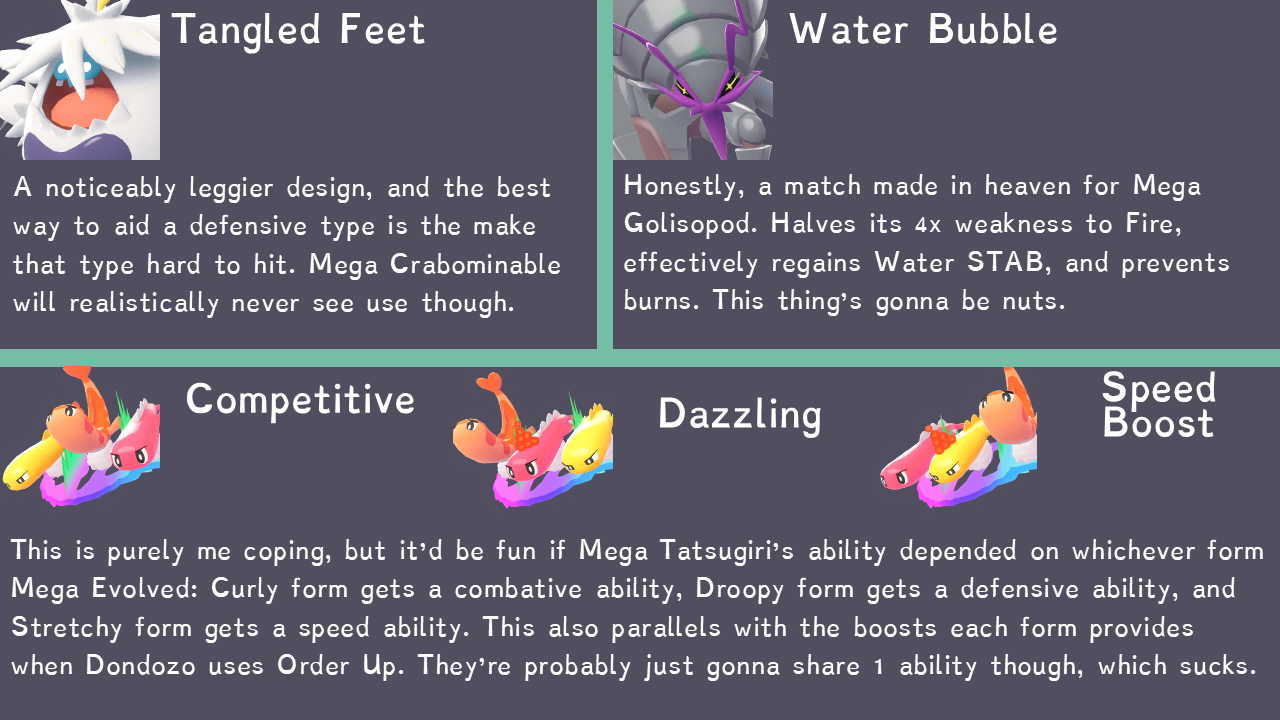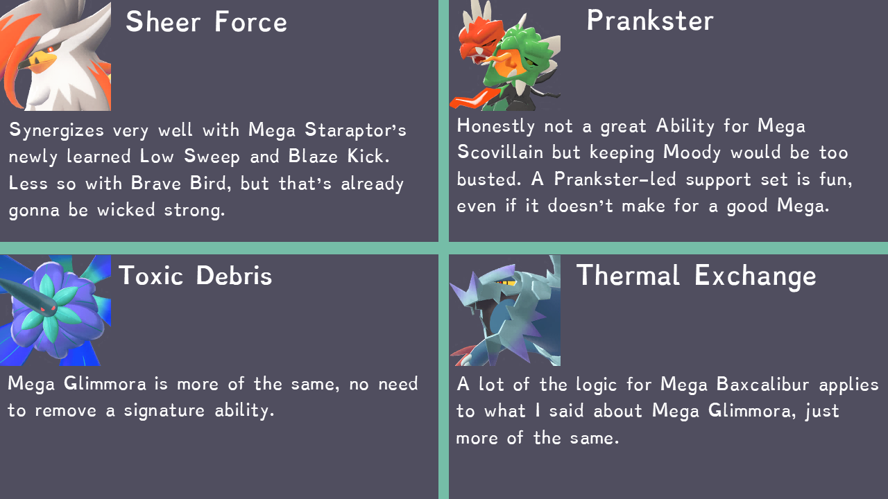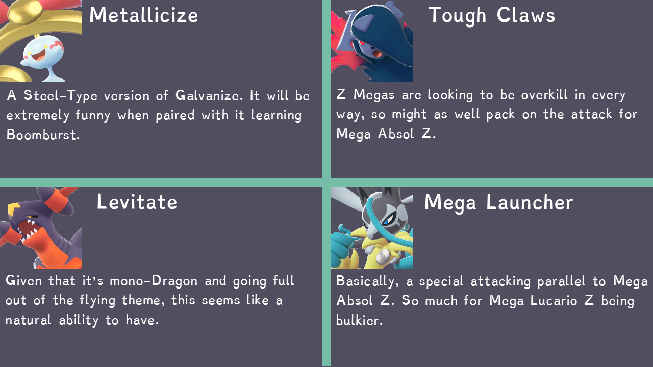 Let's give new Mega Evolutions abilities! I am pitching a few abilities that I think each new Mega may be able to receive and utilize to the best of their ability without being too hard to rationalize flavor wise. Shout out to users like StardustSpy and Mjilnor for pitching some useful options.
