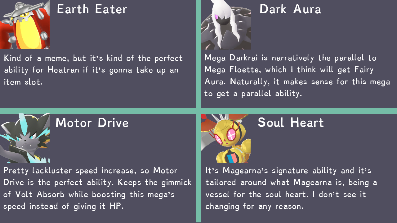 I'm ready to pull the big Gun. Mega Heatran should have Earth Eater. It's designed to have eating be such a core part of its features I think Earth Eater may be a no brainer. Ofc with Earth Eater, Mega Heatran would instantly become one of the most powerful defensive pivots in the tier, mainly on how hard it would be to actually consistently damage it. If we ultimately deem this too strong, Flash Fire still works fine here, walling Fire types are fun.