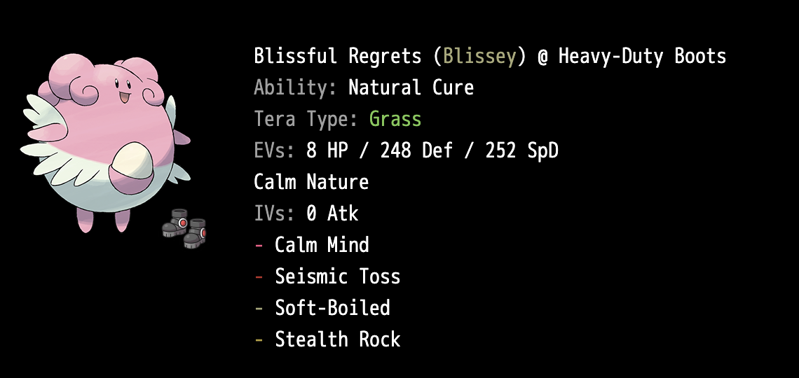 Blissey is mandatory on nearly every stall team. She provides excellent utility as a special wall, while being able to set up Stealth Rock. Since Blissey lost Confide this generation, Calm Mind is necessary to stand up to non-Taunt CM versions of Miraidon. Tera Grass provides utility vs both Tera Water Specs Kyogre and Parabolic Charge Miraidon. If you’re willing to sacrifice the Specs Kyogre match up, then Tera Ground can be run in place. Seismic Toss + Softboiled are essential moves for outlasting opponents.