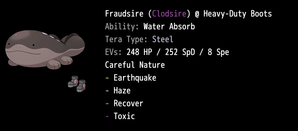 Water Absorb Clodsire is undoubtedly the best Miraidon and Kyogre check in stall. It provides an excellent defense against the aforementioned checks and can viably run Tera Steel or Tera Dark to improve the matchup versus CM Miraidon or NP Mewtwo. Clodsire’s objective is to spread Toxic and tank hits. 8 Speed EVs allow it to outspeed other Clodsire’s. The choice between Haze and Amnesia is entirely up to the builder. Amnesia is viable, but you do risk untimely crits, while Haze risks running out of PP faster.