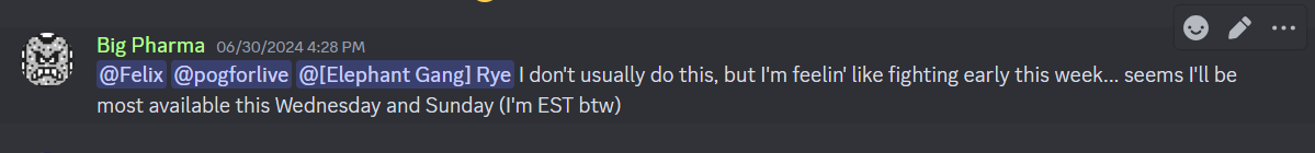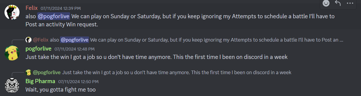 Dude's last message in the server was three days ago, and it was telling someone else in my pool to take the win. I've pinged 'em a few times since then for scheduling or confirmation, but nothing's come of it