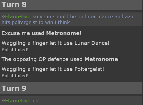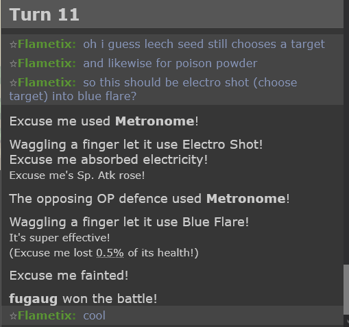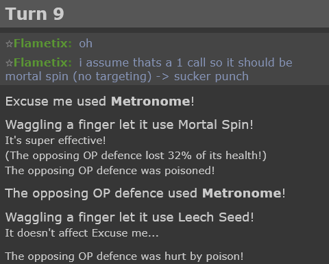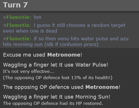 tl;dr I want to sleep. But I also wanted to figure out what this all means in practice. In conclusion I think this is neat and funny but probably won't practically affect anything, feel free to prove me wrong though with another example or anything I'm missing. Hopefully now you have a more informed idea of what this all means for Metronome Battles, because I don't know where to start with anything else. Maybe Showdown will do something about it and render this all irrelevant anyway before it even matters again. Who knows? These are interesting times. Even just Metronome (the move) getting a spotlight for something is nice and noteworthy enough for me.
