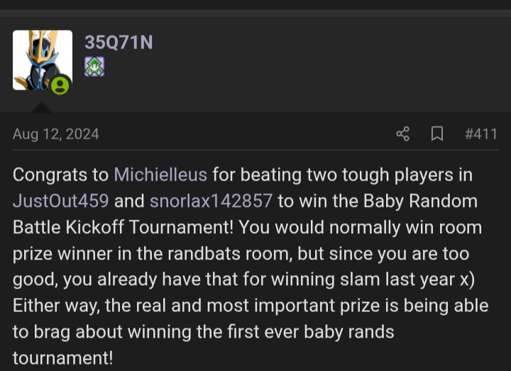 The winner of the Baby Random Battles Open will receive the Room Prize Winner rank for a month, be inducted into the Randbats Hall of Fame, and be awarded points for the Minior Circuit (standings spreadsheet pending), with the winner of the Playoff Round for the circuit earning their choice of a PS! username colour change or username reset, and Room Prize Winner rank for a year!