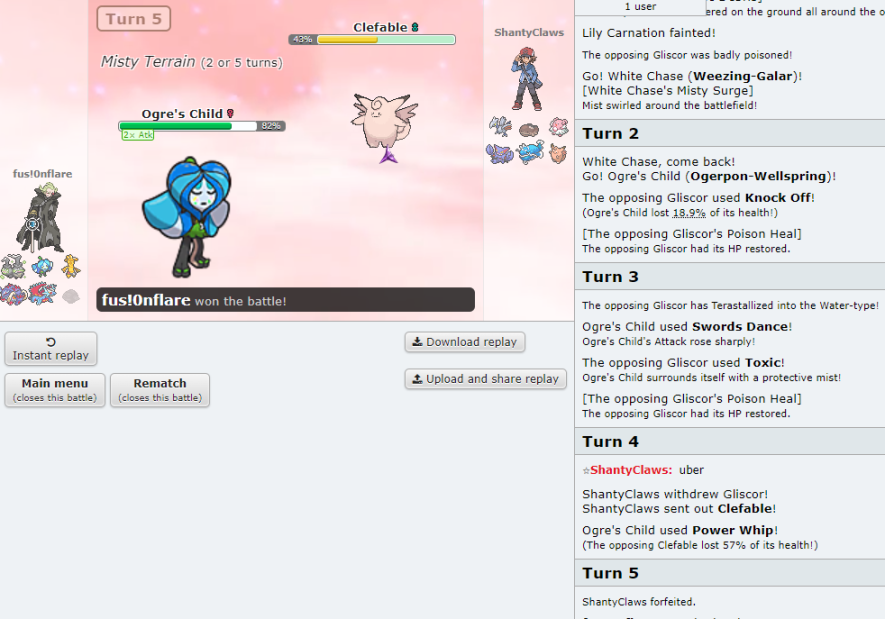 https://replay.pokemonshowdown.com/gen9ou-2185770385 now THIS one I had NO business winning. I play well early on, but a series of misplays in the late game and a lost-50-50 makes it such that i only win the game because of a timely critical hit. undeserved? yes. funny? also yes.