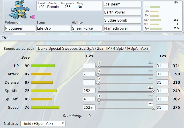 Notice that even with max investments in Speed or Sp. Atk, that it still can be easily outspeed or outgunned by a faster or bulkier pokemon. Adding EVs to HP would be useless in this situation, as Nidoqueen doesn't have the bulk to tank a hit. Using the same setup on Nidoking virtually does the same thing, only with an extra kick in Speed. Any pokemon with a good priority attack can damn near OHKO both of them, which is why I found it important to add some bulk to both. Also, please note than in my first post I specifically stated that the EVs are only set to my preferences and that they should be set as the player sees fit. This is helpful to new Smogon players that wish to experiment or use the EV settings that have worked for them on other metagames.