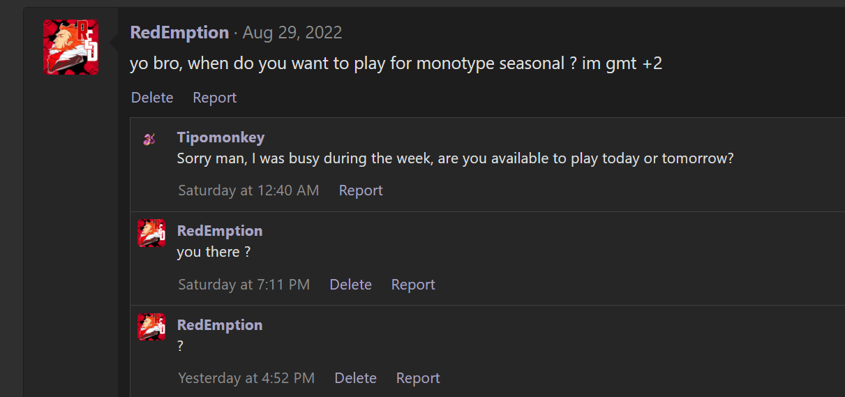 Your opponent gave you a wide range of times and tried to add additional availability than what they originally offered, while you only offered 8 PM GMT+5 as your availability, and were not around from Tuesday evening through Friday night to reply to their other scheduling attempts. Unfortunately it looked like finding a perfect time was difficult for both of you, but Quinn tried to compensate for that while you weren't around much.he gave me all times im busy at smh but ok ig...