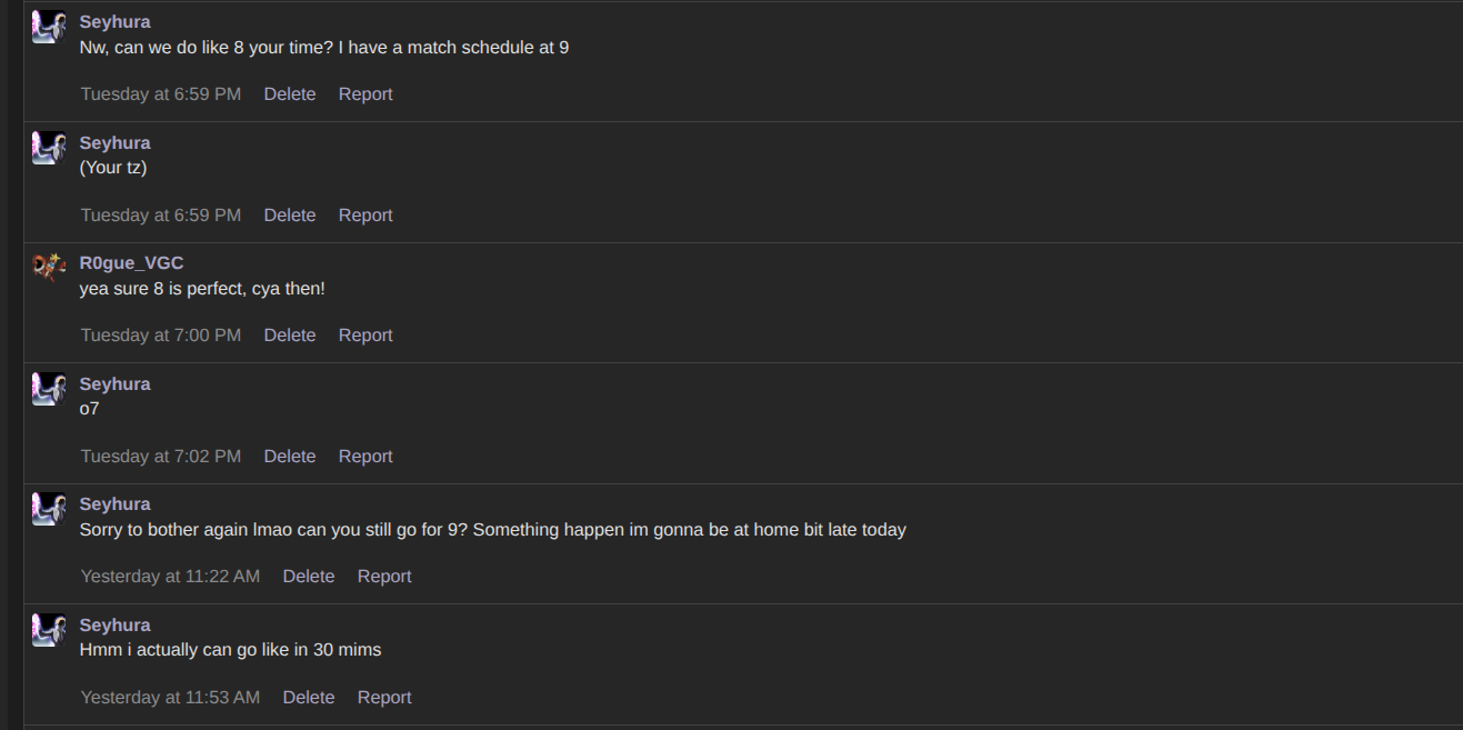 original scheduled time was 8 pm my time but i compensated for 9 my time as well, maybe you got tzs wrong, which is really unfort :(refusing act, you didnt show up the ORIGINAL scheduled time, i waited for 2 hours and i was open to re schedule but you came online 7 hours after the original time and decided that you were gonna play when it was 12 am - 1 am for me (thursday by then)