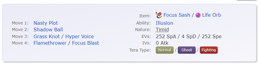 Nasty Plot Hisuian Zoroark is a devastating special wallbreaker thanks to its combination of unique typing, coverage, fantastic Speed, and a high Special Attack stat, and it can almost always threaten a KO after a boost. Its ability, Illusion, provides good utility to it by letting it disguise itself as a teammate and drawing out a foe that checks that aforementioned teammate and blasting them with powerful special attacks. Shadow Ball hits nearly everything in the tier for solid damage with very few drawbacks, and it has the lovely side effect of potentially dropping a foe's Special Defense. Grass Knot can be utilized to sink many heavy defensive threats, such as Garganacl, Great Tusk, and Dondozo. This also comes with the advantage of being a reliable move against heavy foes like Ting-Lu without burning up valuable PP on Focus Blast or dealing with its less-than-stellar accuracy. Flamethrower hammers would-be switch-ins like Kingambit and Scizor. Alternatively, Focus Blast can be used to hit Ting-Lu, Hydreigon, Kingambit, and Garganacl with the same move. Tera Ghost allows Shadow Ball to more reliably OHKO Gholdengo on Focus Sash sets, and it also allows +2 Shadow Ball to OHKO Baxcalibur, Volcarona, Walking Wake, Iron Moth, and Slowking. Alternatively, Tera Fighting turns its Dark-type weakness into a resistance, leaving it less susceptible to Kingambits' Sucker Punch, Meowscaradas' Knock Off, and Greninjas' Dark Pulse, and powers up Focus Blast to staggering heights. Tera Fighting Focus Blast OHKOs Baxcalibur and Garganacl and even has a good chance to OHKO Ting-Lu at +2 after Stealth Rock. Alternatively, Tera Fairy allows Hisuian Zoroark to hold off Dark-types as well as become immune to Dragapult's Dragon-type attacks. Focus Sash guarantees that Hisuian Zoroark has a chance to set up or attack. On the other hand, Life Orb can be used to add further power to Hisuian Zoroark's already formidable prowess. Life Orb allows Focus Blast to OHKO Baxcalibur, and it also ensures that +2 Shadow Ball OHKOes Volcarona, physically defensive Rotom-W, and Corviknight after Stealth Rock.