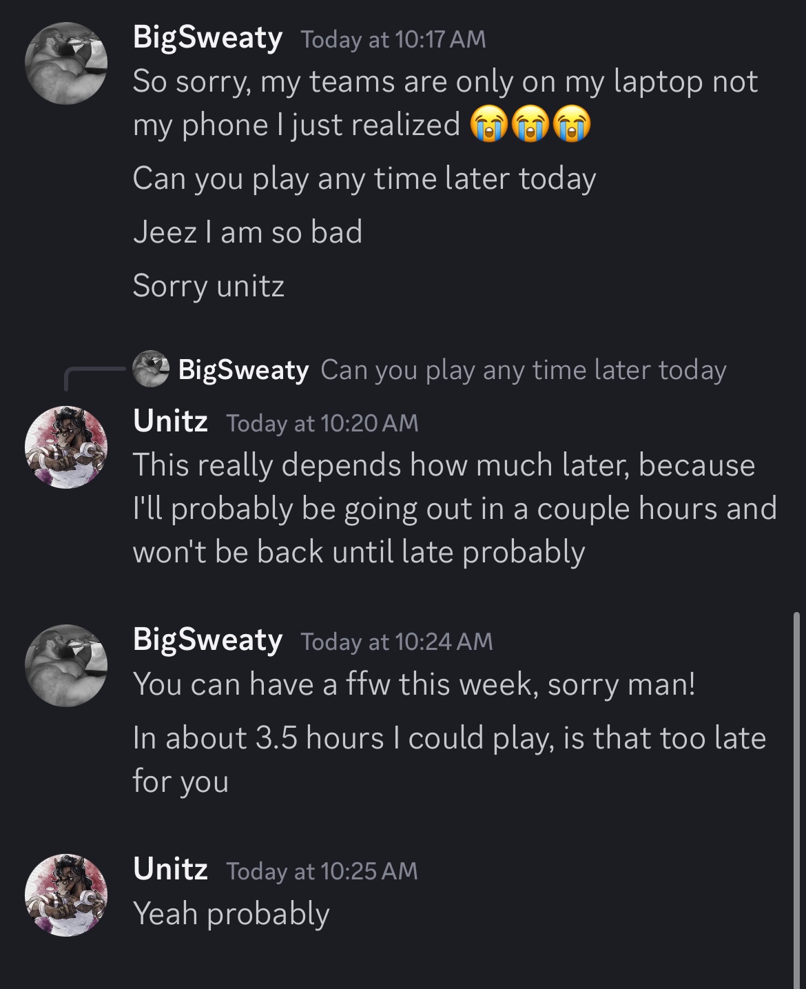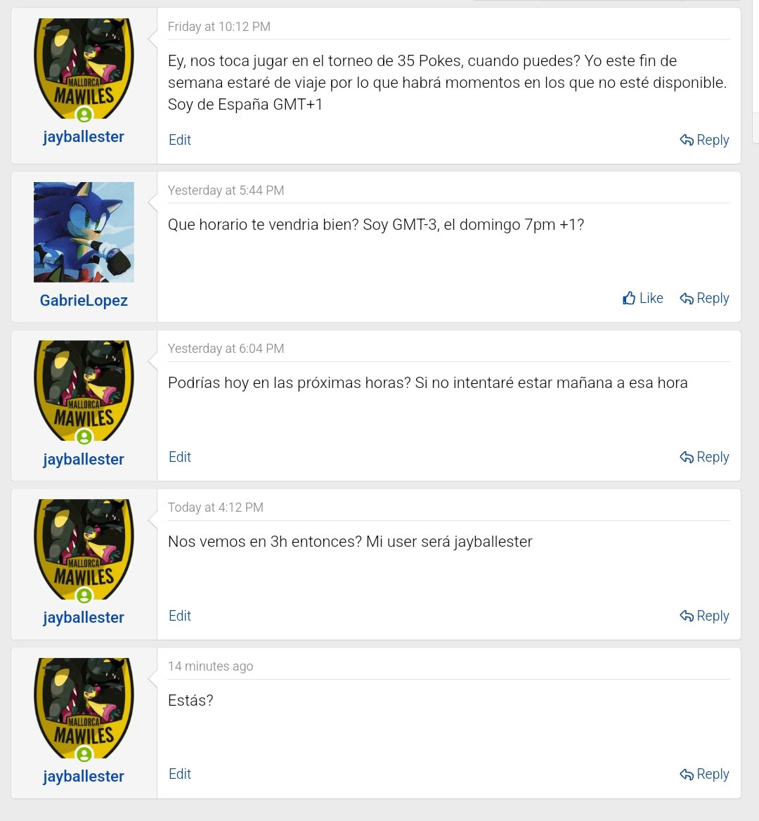 Calling noshow as I'm on a trip and I'm not available later. I had no further attempt to schedule besides the first one my opponent proposed. (Messages are in Spanish mb)